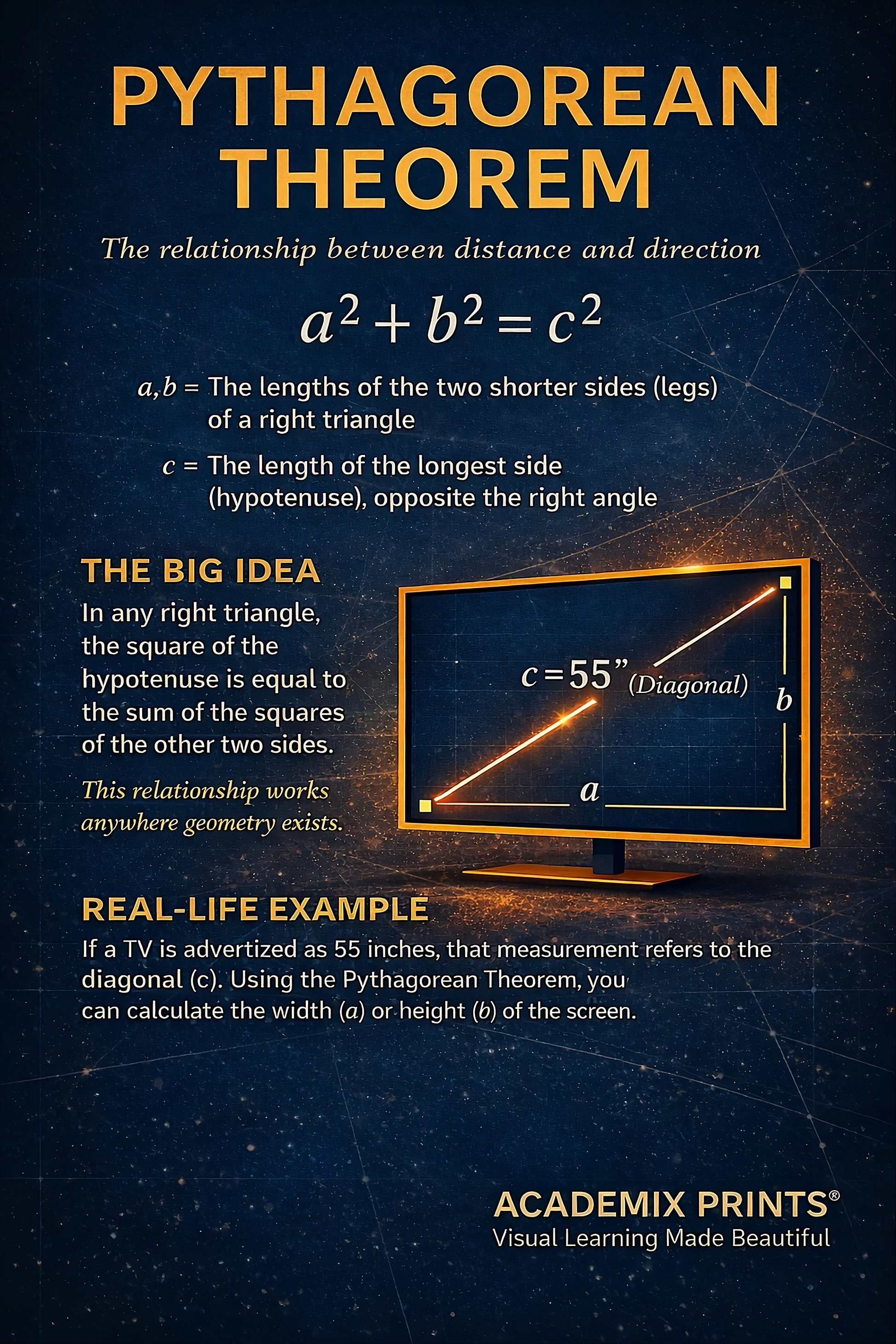 Make math both accessible and inspiring! This Pythagorean Theorem poster from Academix Prints® is the perfect addition to any classroom, study nook, or student bedroom. With a clean, modern design, it breaks down one of math’s most important formulas so anyone can understand—and remember—it.